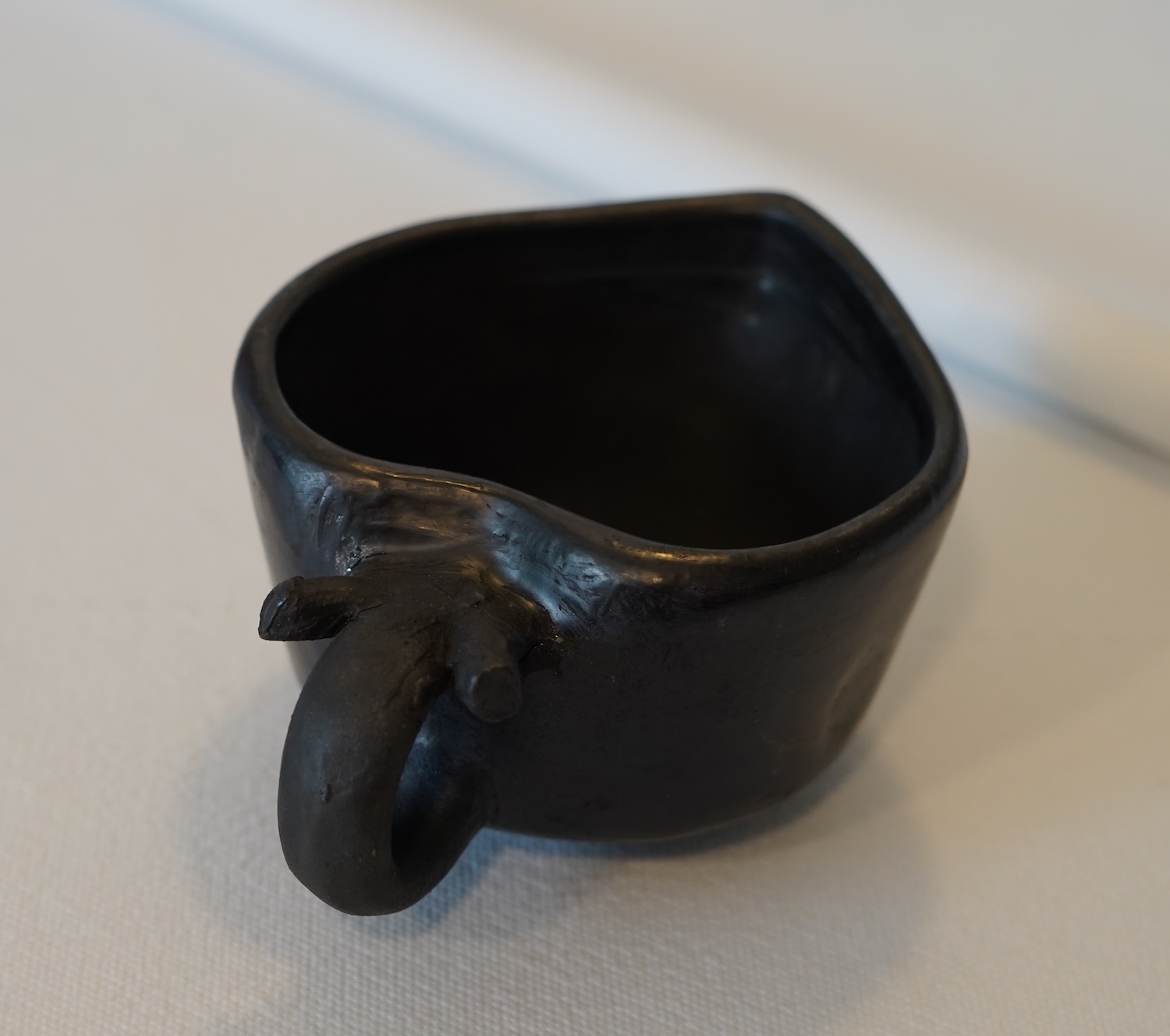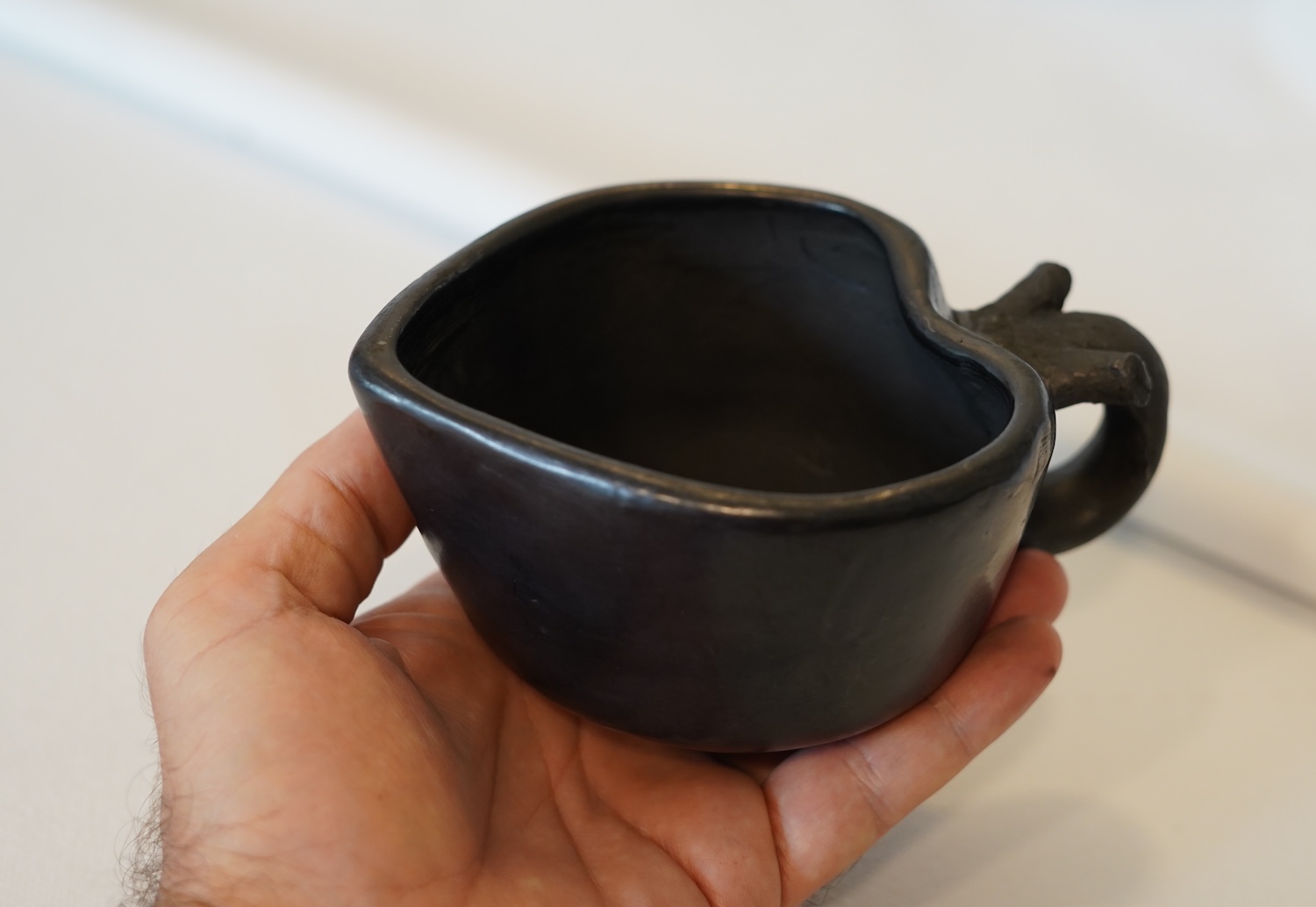 Taza en forma de corazón de barro negro.